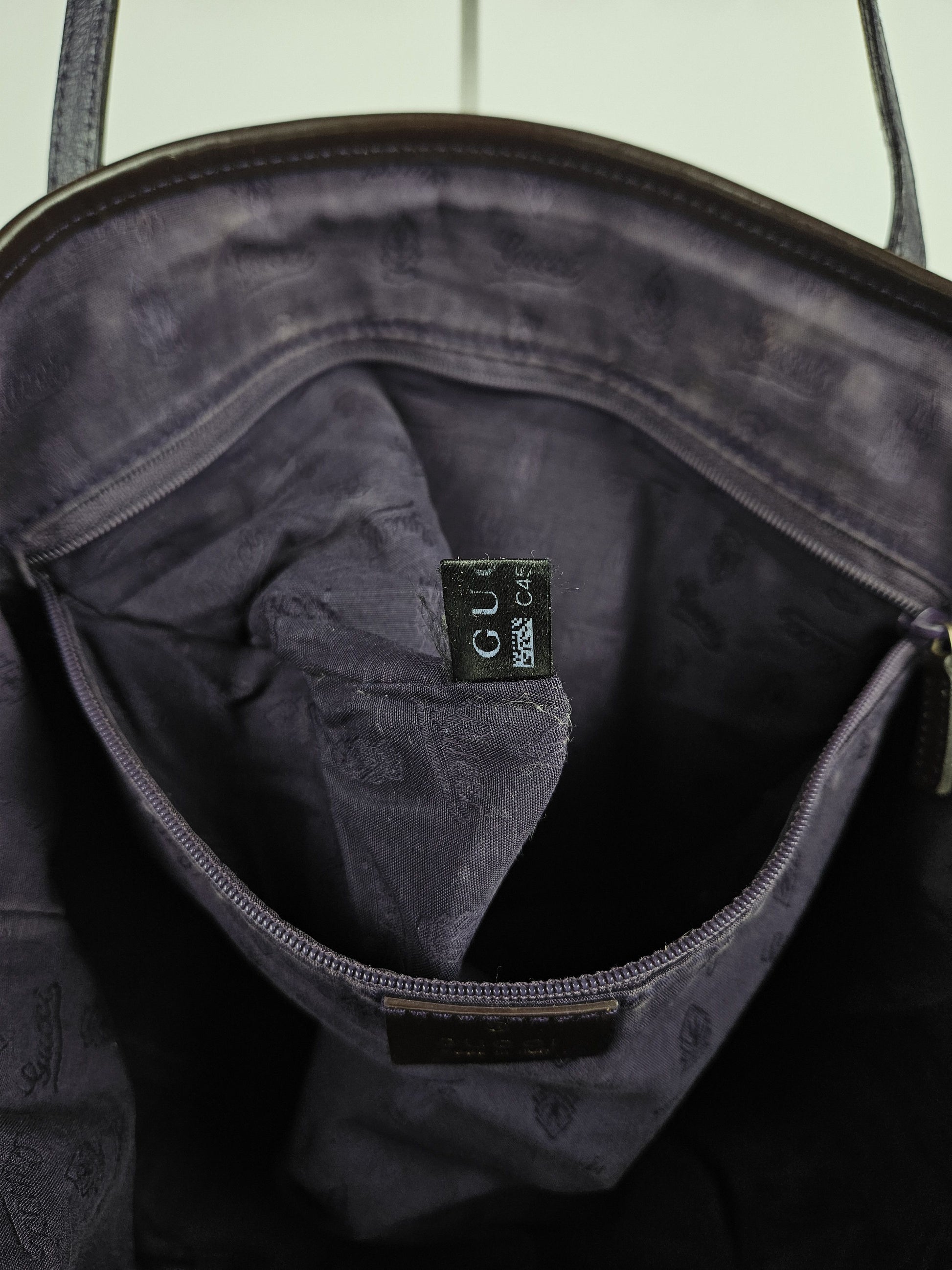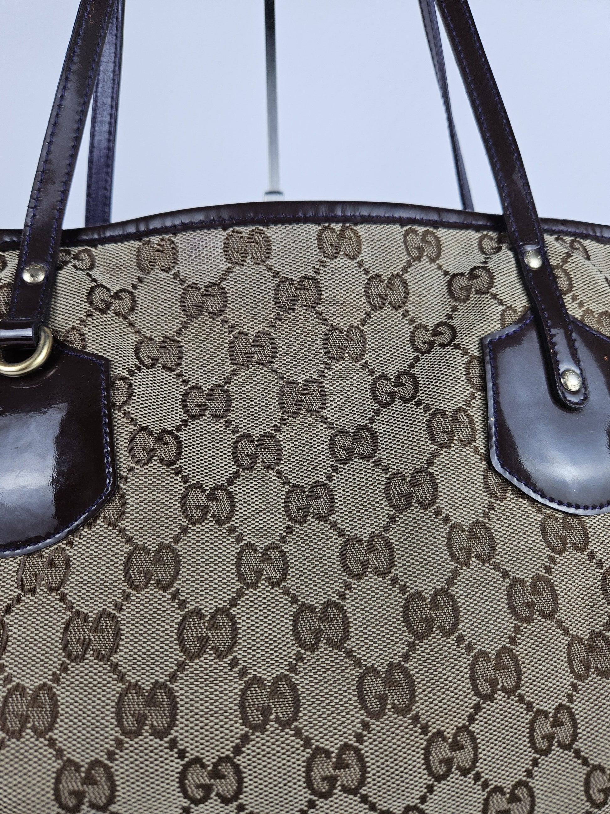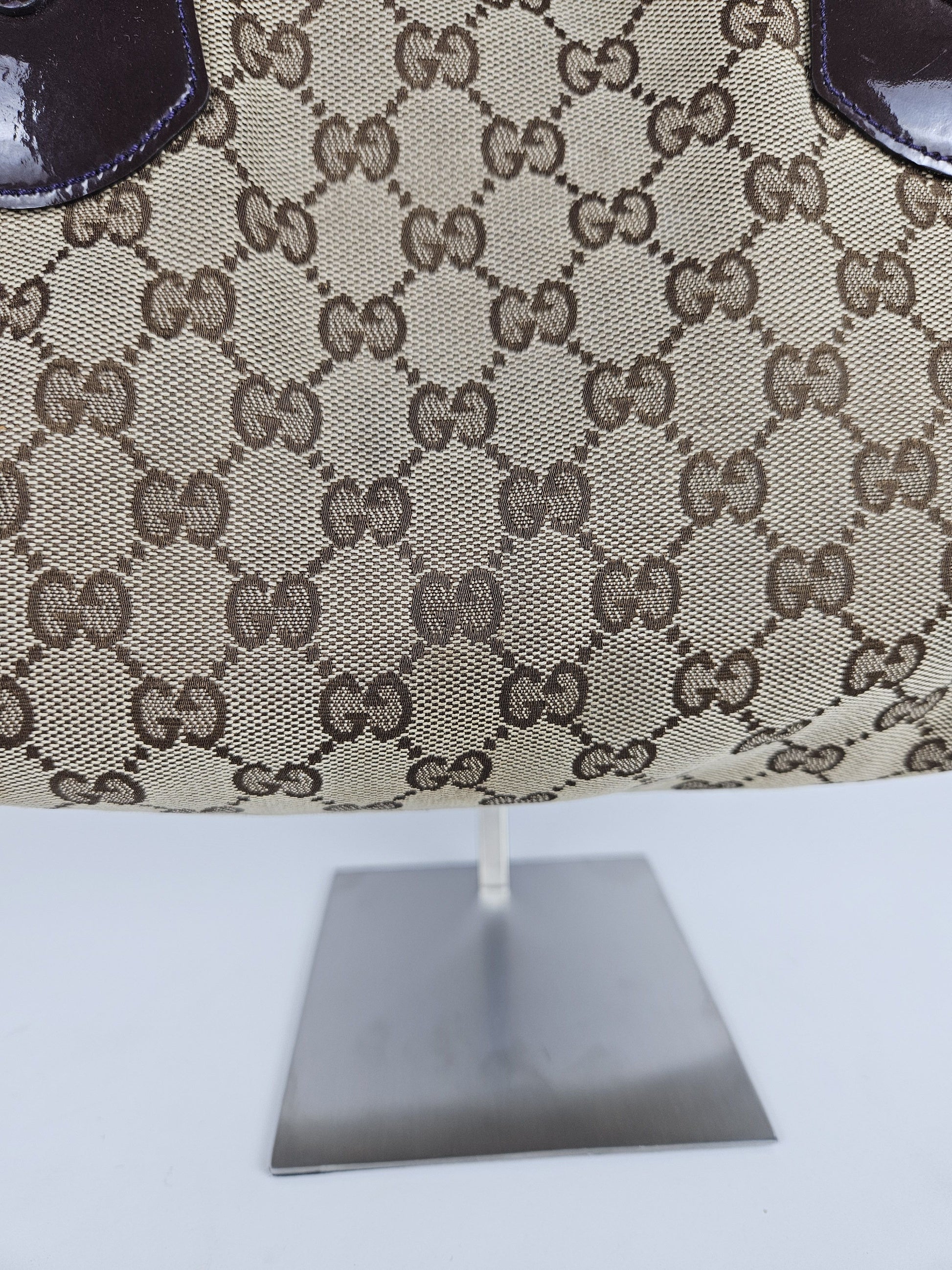 Slightly faded lining, small scratches on the patent leather, small and shallow cracks on the handles, a couple very faint, barely visible stains on the canvas. No original box or accessories.