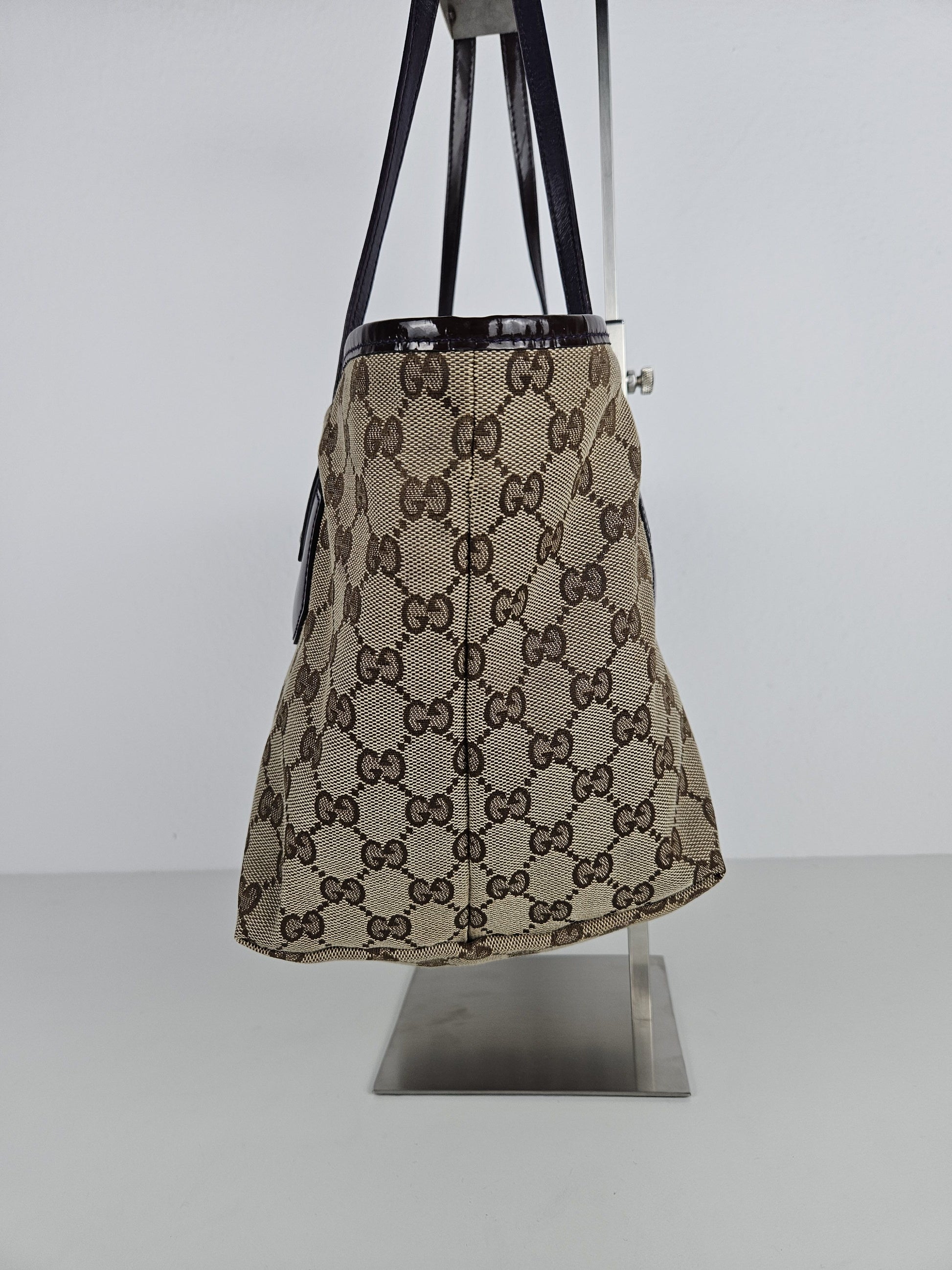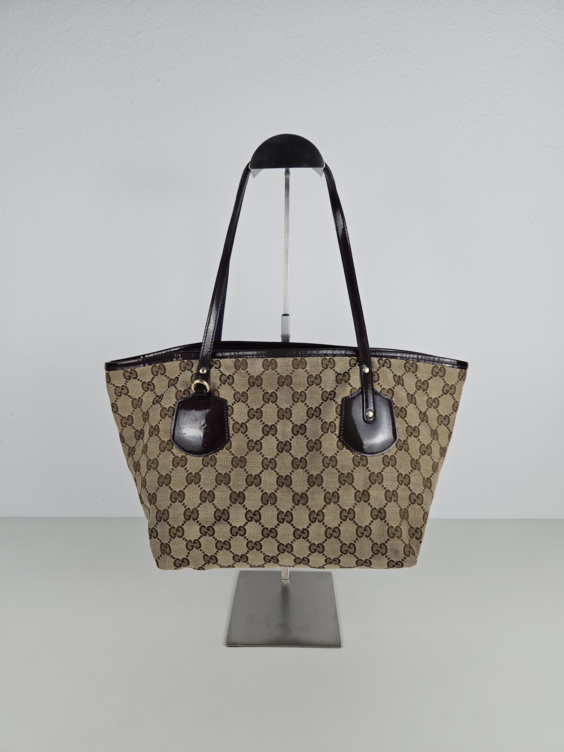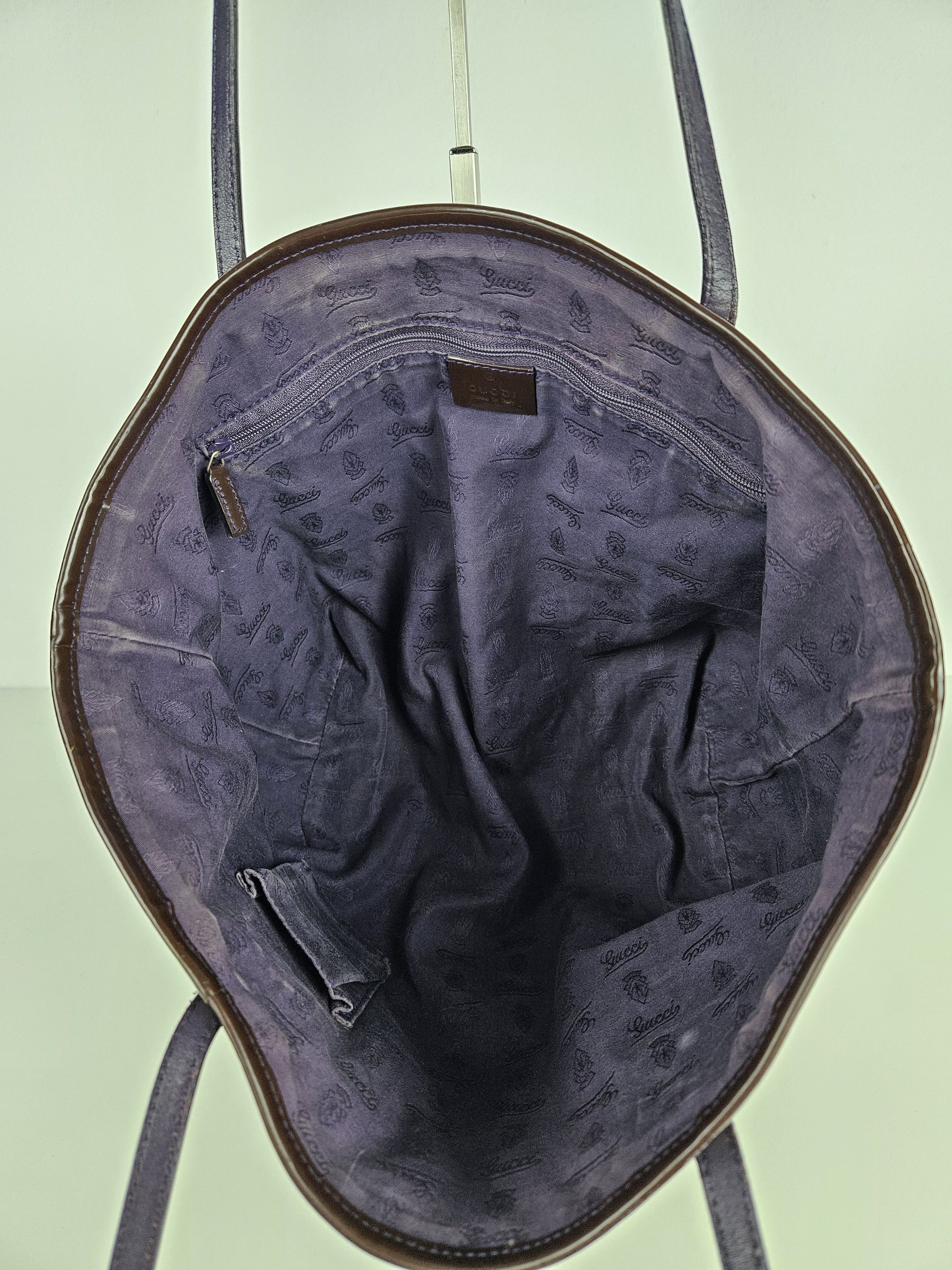 Slightly faded lining, small scratches on the patent leather, small and shallow cracks on the handles, a couple very faint, barely visible stains on the canvas. No original box or accessories.