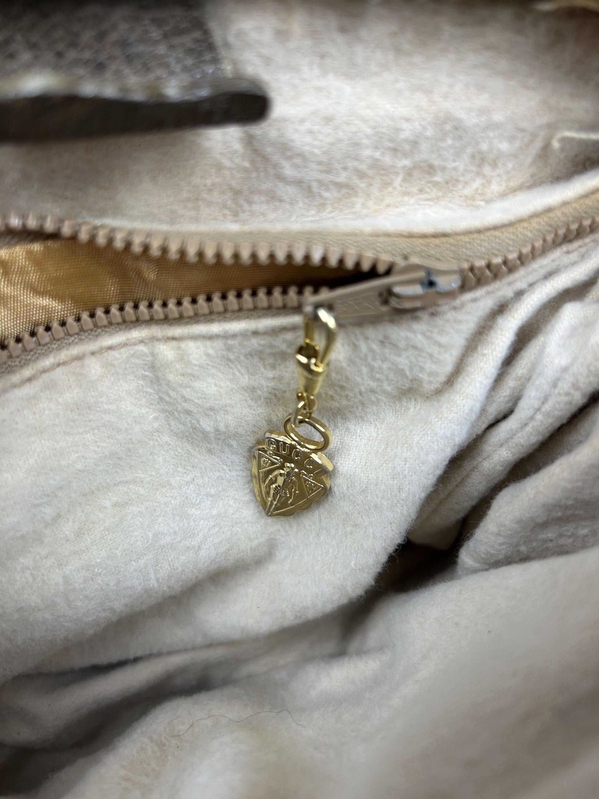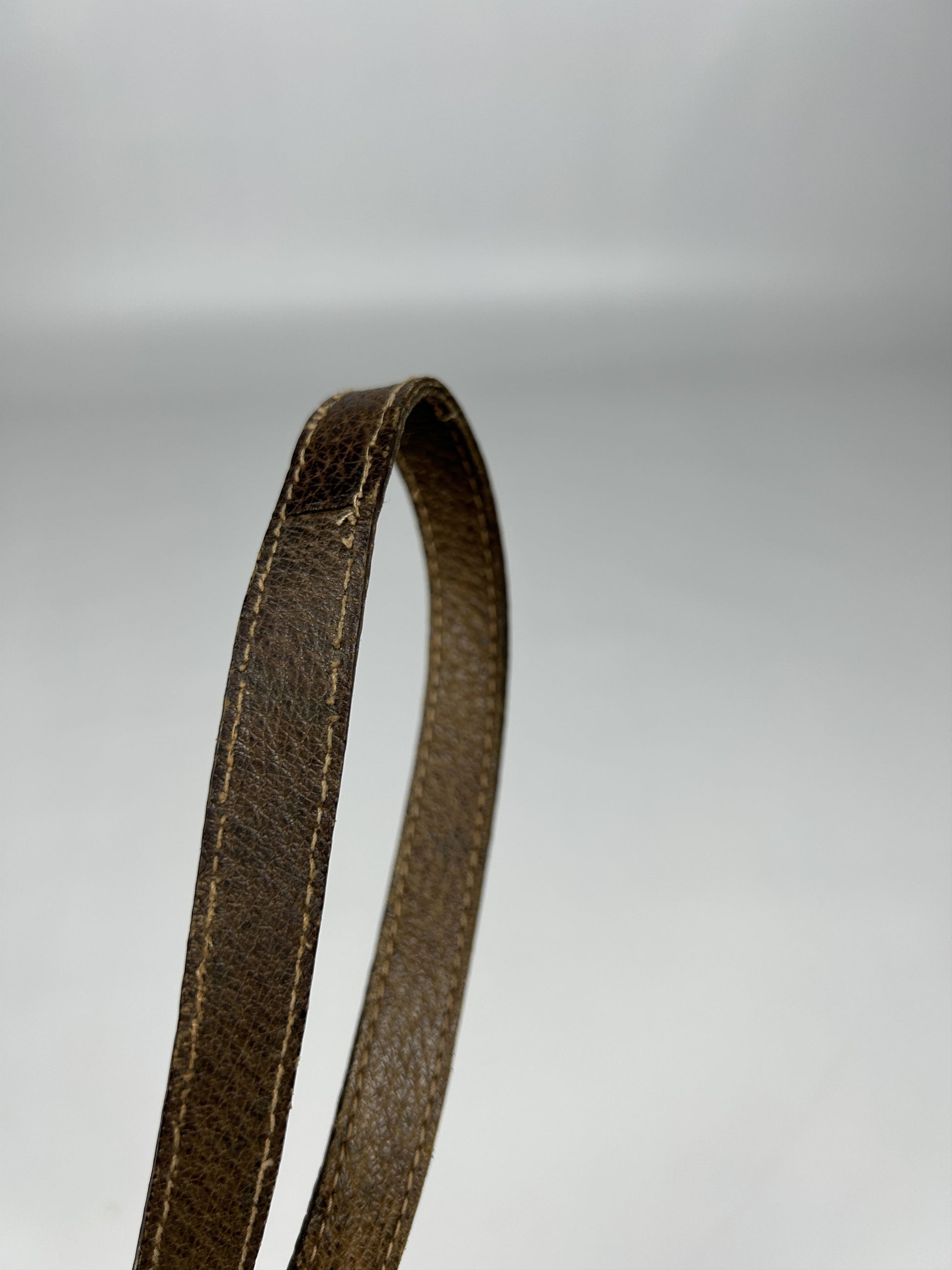 Light strap and strap edge wear as shown. Small cracks on the sides of the bag, next to where the top trim is attached. Interior coating got sticky due to age and was removed. Faded tag. Authenticated by a trustworthy, third-party company, digital certificate of authenticity included. Comes with a replacement Gucci dustbag (newer than the bag itself).