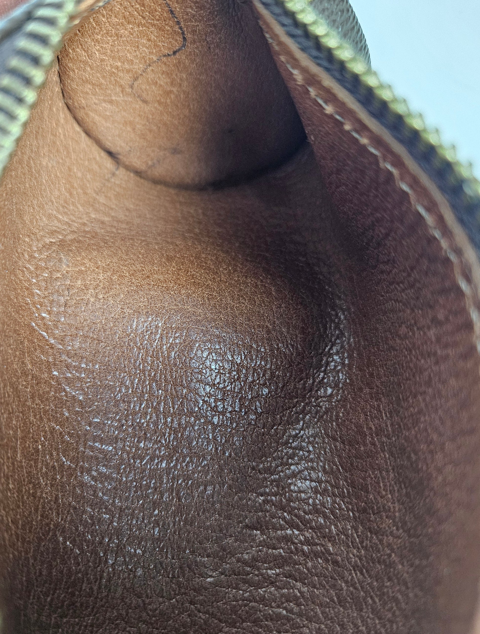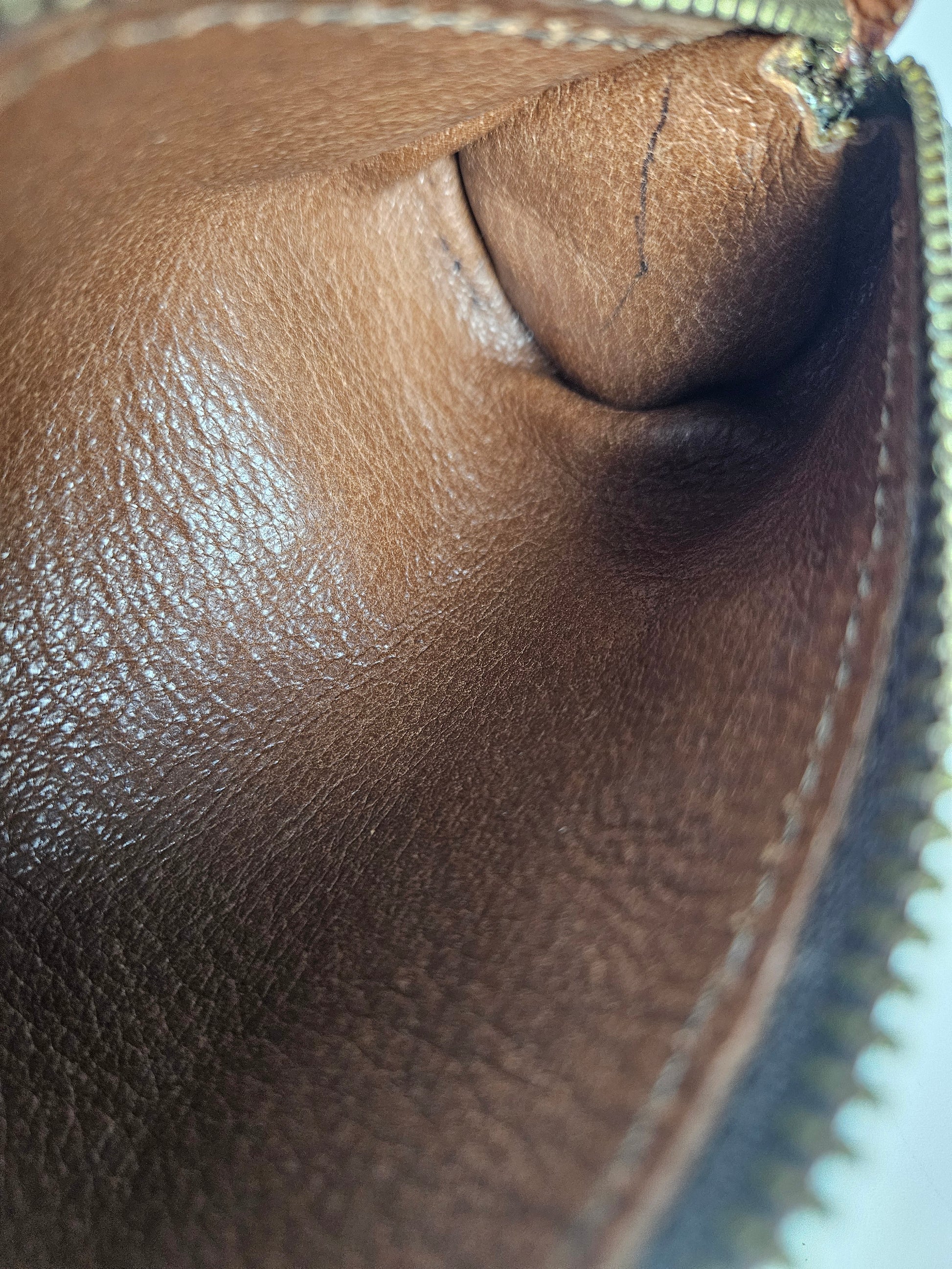 Replaced zipper, small, repaired crack on the edge, pen marks inside. Comes with a dustbag but no original box or other accessories.